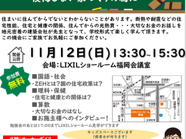 皆さんこんにちは。日本ビルドの石橋です。今回も年2回開催の「家づくり教室」をLIXIL福岡ショールームで今月開催しました。 新築住宅需要が冷え込んでいる昨今ですが、多くの方にご参加いただきました。例年通り、「国語・社会」、「理科・保健」、「算数」・お施主様インタビュウーと進んでまいりま…