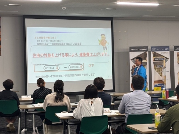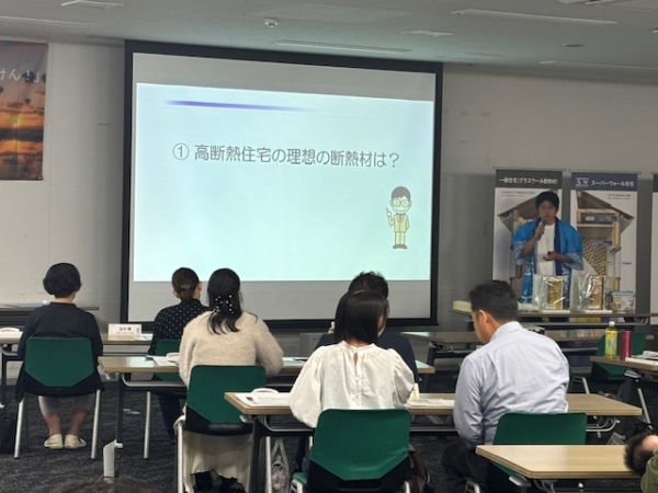 数種類の断熱材の長所・短所など、また断熱性の違いによる健康に関する事を学びました。
