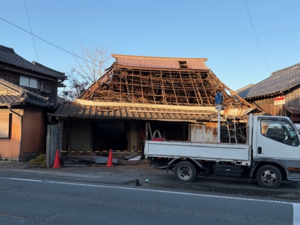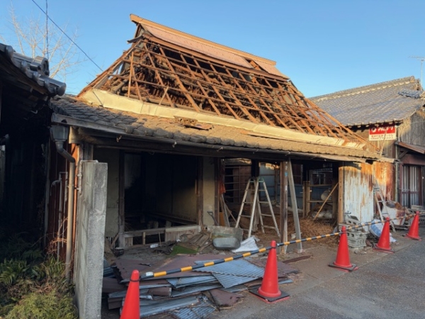 なぜかというと重機が入らず手崩しだから。藁屋根の上にトタンをかぶせています。